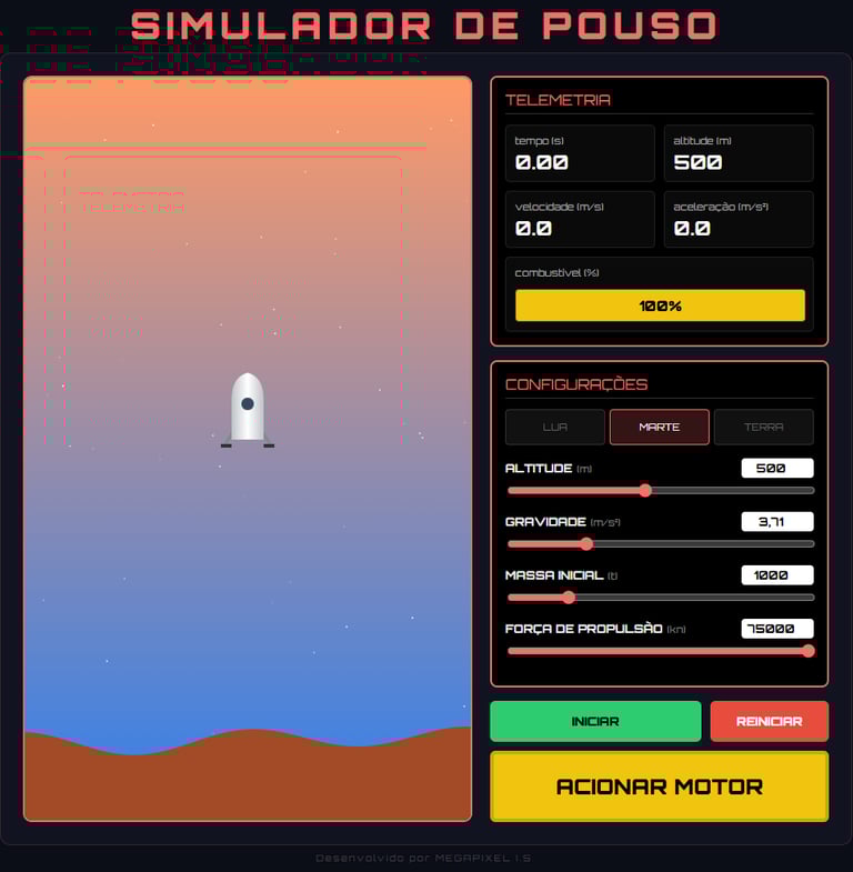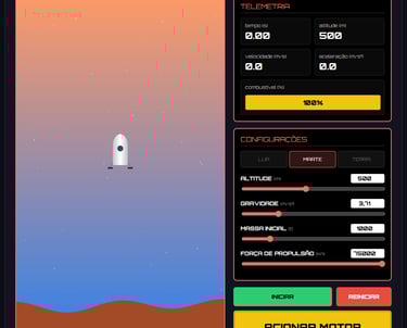 Demonstração prática de cálculo cinemático em tempo real. O algoritmo processa variáveis de empuxo, massa variável (consumo de combustível) e aceleração gravitacional constante para simular vetores de pouso retropropulsado.