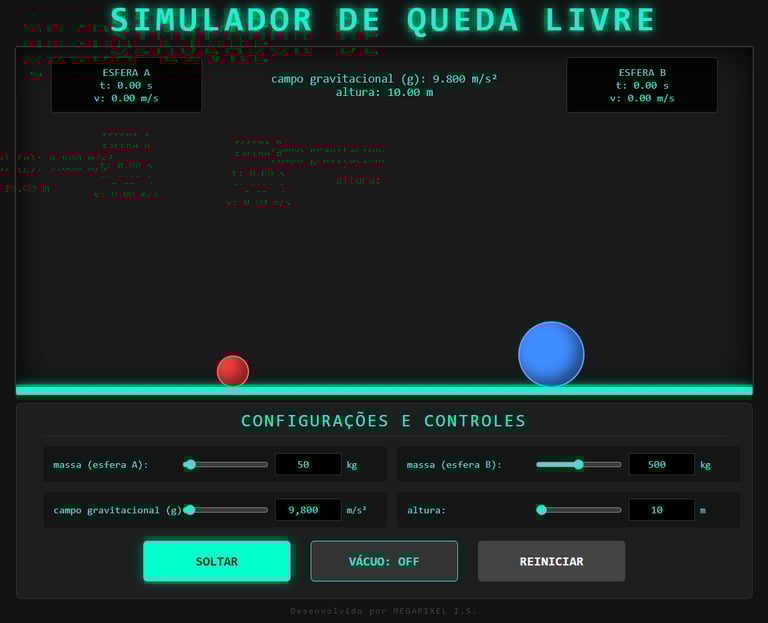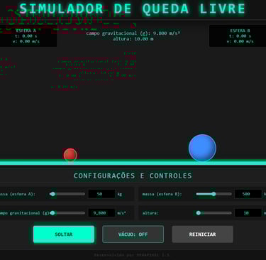 Demonstração prática de cinemática e resistência do ar. O algoritmo processa a aceleração da gravidade aplicada a diferentes massas e formatos, permitindo comparar o vácuo perfeito com a realidade atmosférica em tempo real.