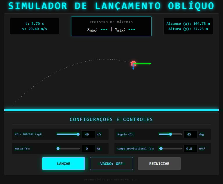 Demonstração prática de trajetória parabólica e decomposição de vetores em tempo real. O algoritmo processa variáveis de ângulo, velocidade inicial e aceleração gravitacional para simular o alcance e a altura máxima de projéteis em diferentes atmosferas.